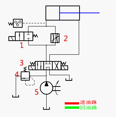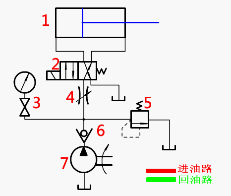 油路說(shuō)明:在進(jìn)油管路上設(shè)置節(jié)流閥,控制液壓油流量,進(jìn)而控制活塞桿移動(dòng)速度