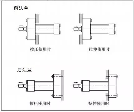 (1)法蘭安裝適合于液壓缸工作過程中固定式安裝,其作用力與支承中心處于同一軸線的工況;其安裝方式選擇位置有端部、中部或尾部三種,如何選擇取決作用于負(fù)載的主要作用力對活塞桿造成壓縮(推)應(yīng)力、還是拉伸(拉)應(yīng)力,一般壓縮(推)應(yīng)力采用尾部、中部法蘭安裝,拉伸(拉)應(yīng)力采用端部、中部法蘭安裝,確定采用端部、中部或尾部法蘭安裝需同時結(jié)合系統(tǒng)總體結(jié)構(gòu)設(shè)計(jì)要求和長行程壓縮(推)力工況的液壓缸彎曲穩(wěn)定性確定。